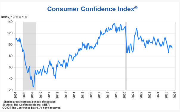 “Consumer confidence weakened in September, declining to the lowest level since April 2025. The present situation component registered its largest drop in a year. Consumers’ assessment of business conditions was much less positive than in recent months, while their appraisal of current job availability fell for the ninth straight month to reach a new multiyear low.”