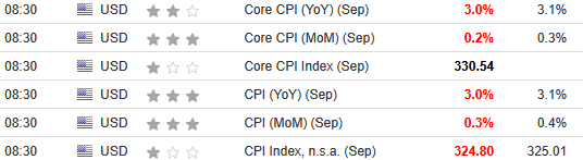 The results missed economists’ consensus estimates. The table below is courtesy of Investing.com. The left column represents September’s figures, while the right column represents forecasters’ expectations. As you can see, the red metrics highlight how inflation was cooler than anticipated.