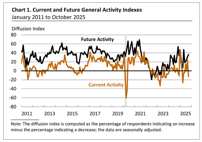 “The diffusion index for current general activity dropped 36 points to -12.8 in October, its lowest reading since April. Twenty-five percent of the firms reported decreases in general activity this month (up from 17 percent last month), while 12 percent reported increases (down from 40 percent).”