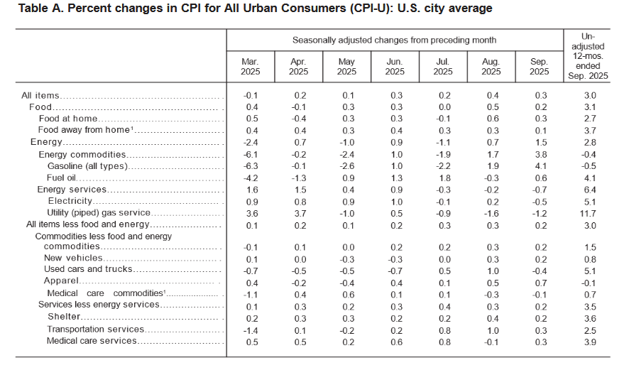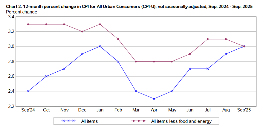 The September 2025 Consumer Price Index of All Urban Consumers (CPI-U) report indicates that inflation increased by 0.3% for the month, down from 0.4% in August. These data were released at 8:30 am EST on October 24, 2025, by the Bureau of Labor Statistics (BLS). Before seasonal adjustment, the year-over-year (Y-o-Y) inflation rate in the all-items index grew by 3.0%, up from 2.9% in August.