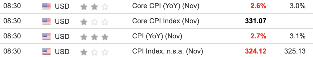 Today’s results also missed economists’ consensus estimates. The table below is courtesy of Investing.com. The left column represents November’s figures, while the right column represents forecasters’ expectations. As you can see, the red metrics highlight how inflation was subdued relative to forecasts.