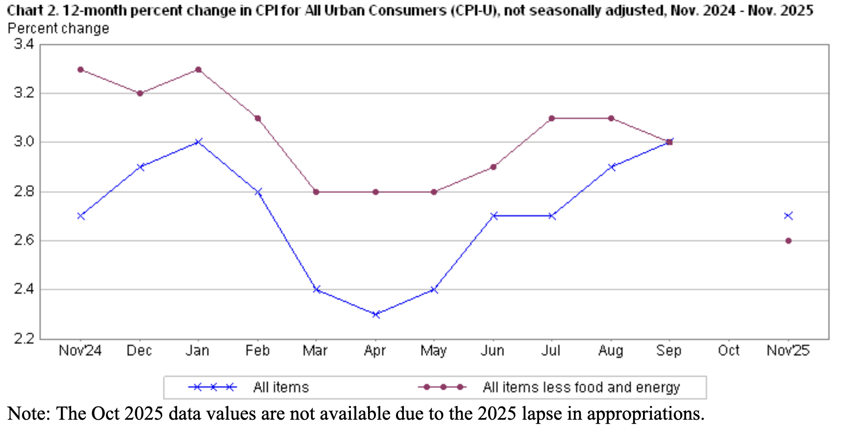 The November 2025 Consumer Price Index of All Urban Consumers (CPI-U) report indicates that inflation increased by 0.2% over the last two months, down from 0.3% in September. These data were released at 8:30 am EST on December 18, 2025, by the Bureau of Labor Statistics (BLS). Before seasonal adjustment, the year-over-year (Y-o-Y) inflation rate in the all-items index grew by 2.7%, down from 3.0% in September. As a reminder, the October CPI report was cancelled due to the government shutdown, so there are no comparable figures on a MoM basis.