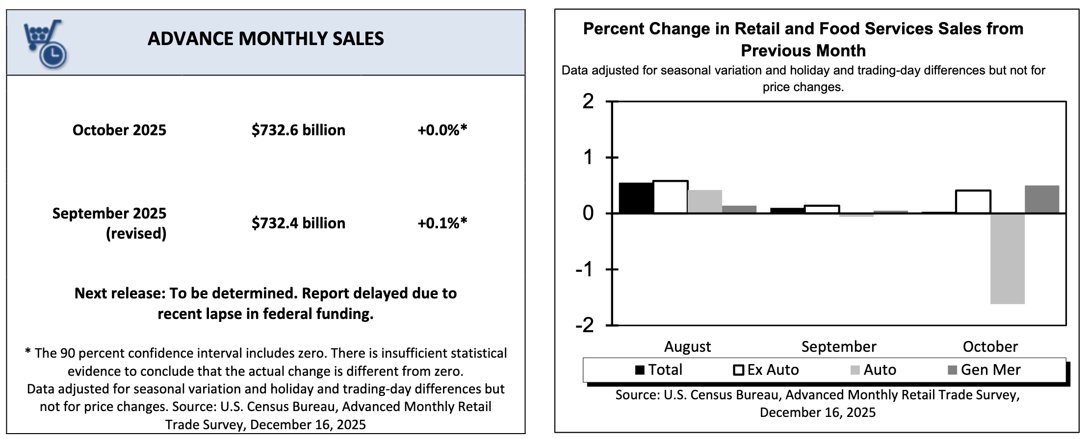 “Retail trade sales were up 0.1 percent (±0.5 percent)* from September 2025, and up 3.4 percent (±0.5 percent) from last year. Nonstore retailers were up 9.0 percent (±1.2 percent) from last year, while food service and drinking places were up 4.1 percent (±1.8 percent) from October 2024.”