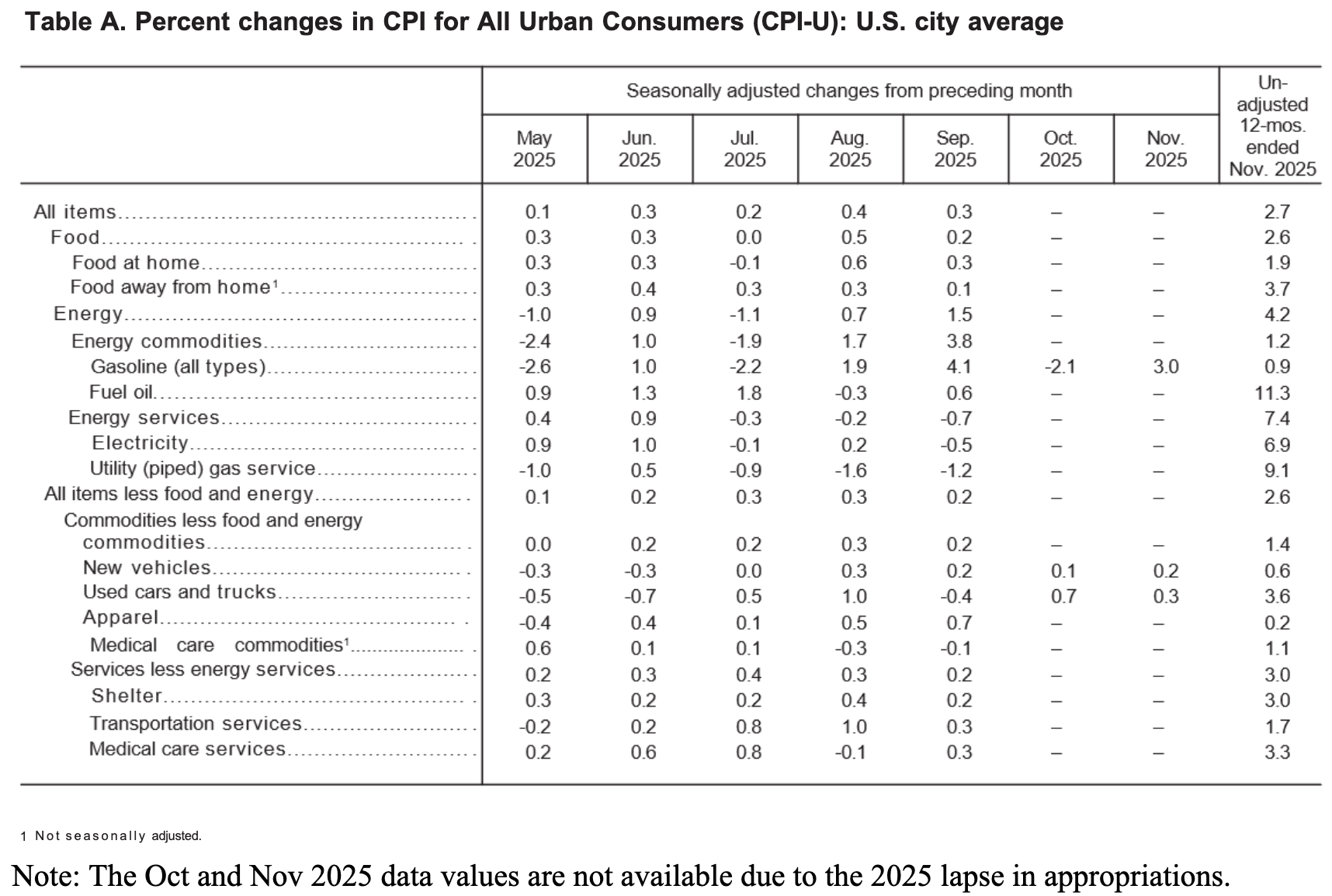 Before seasonal adjustments, the CPI-U for November 2025 increased by 2.7% Y-o-Y to an index level of 324.122. Since these figures are unadjusted, they include regular seasonal price fluctuations that can create volatility in the results.