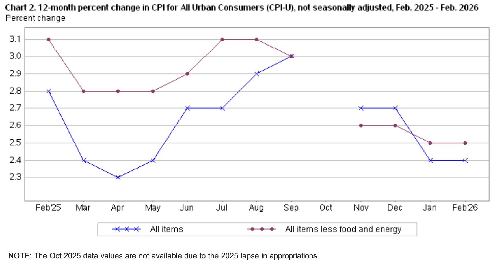 The February 2026 Consumer Price Index of All Urban Consumers (CPI-U) report indicates that inflation increased by 0.3% this month, up from the 0.2% rise in January. These data were released at 8:30 am EST on March 11, 2026, by the Bureau of Labor Statistics (BLS). Before seasonal adjustment, the year-over-year (Y-o-Y) inflation rate in the all-items index grew by 2.4%, matching the annualized figure from January.