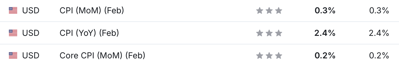 It was a relatively uneventful CPI release as the figures aligned with economists’ consensus estimates. The table below is courtesy of Investing.com. The left column represents February’s figures, while the right column represents forecasters’ expectations. As you can see, there were no surprises in February.